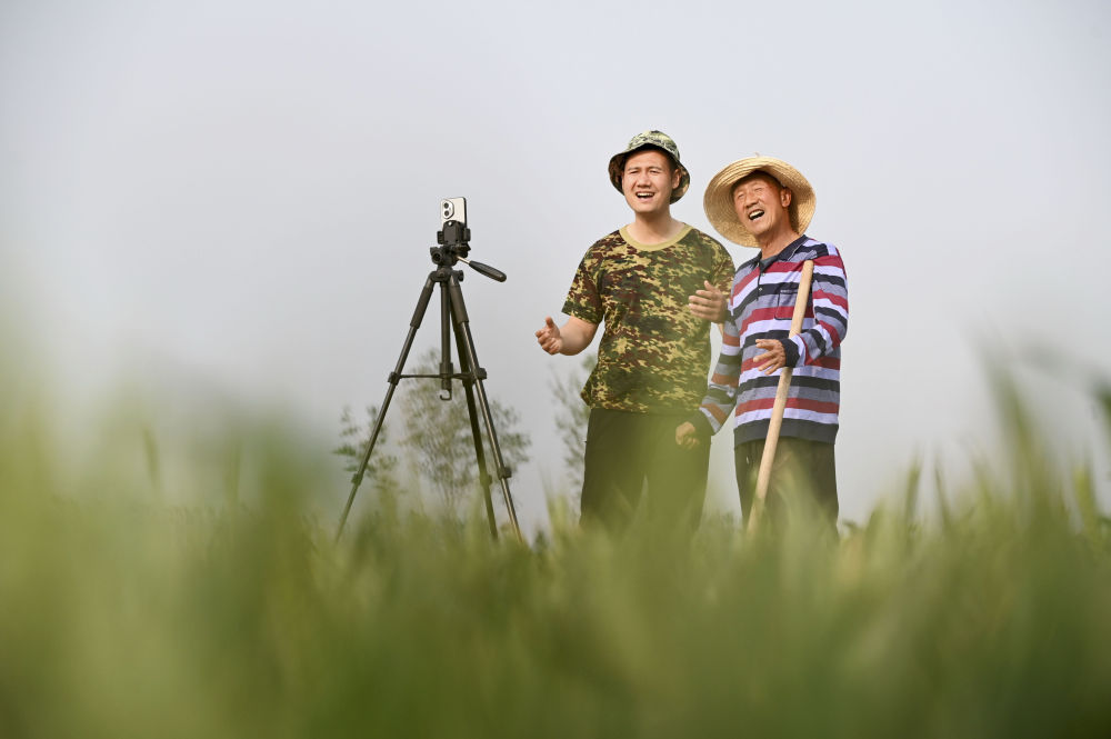 2025年4月20日,康建庄(右)和康开放父子俩在田野上直播唱歌。在河南省沁阳市王召乡北龙盘村,有一对爱唱歌的“快乐父子俩”。凭借着淳朴的嗓音、充满浓郁乡间风味的歌曲和满满正能量的歌词,父子俩唱成了拥有数百万粉丝的网络红人。