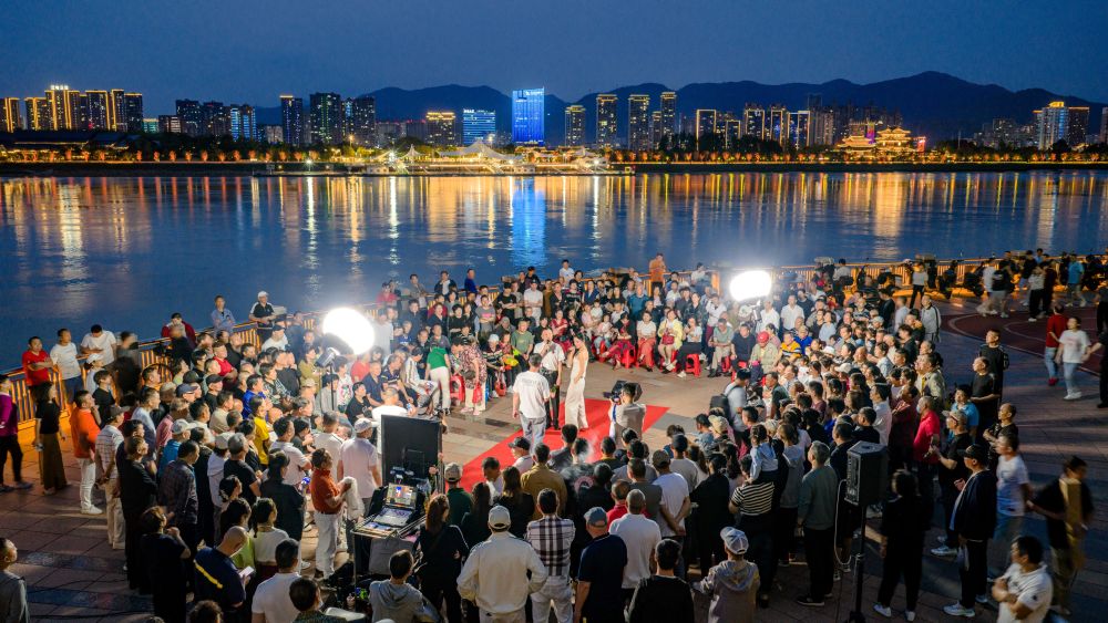 由10多名文艺爱好者组成的草根主播团队在浙江省温州市鹿城区帆影广场表演(无人机照片,2025年5月27日摄)。该团队时常在公园和广场进行公益“街唱直播”,表演内容包括歌曲、舞蹈、小品等。他们在面向市民游客线下演出的同时,还通过线上直播的方式“献艺”。团队希望通过表演,在自娱自乐的同时为城市增加些文艺范、时尚味和烟火气。