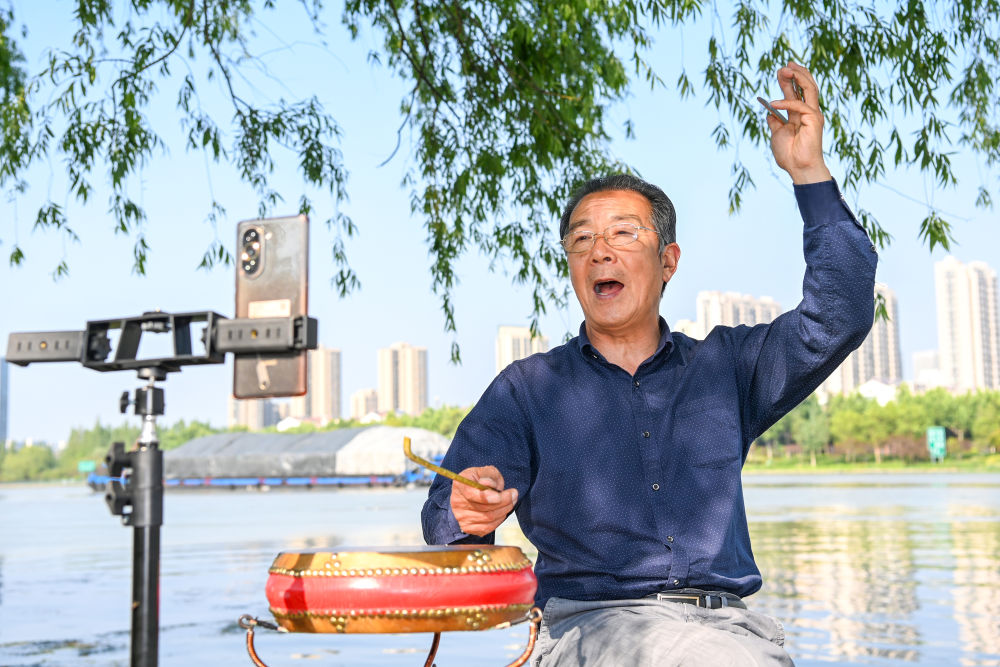 2025年5月11日,在江苏宿迁市宿城区中运河书场,苏北大鼓国家级非遗代表性传承人牛崇祥直播表演苏北大鼓,讲述运河文化。