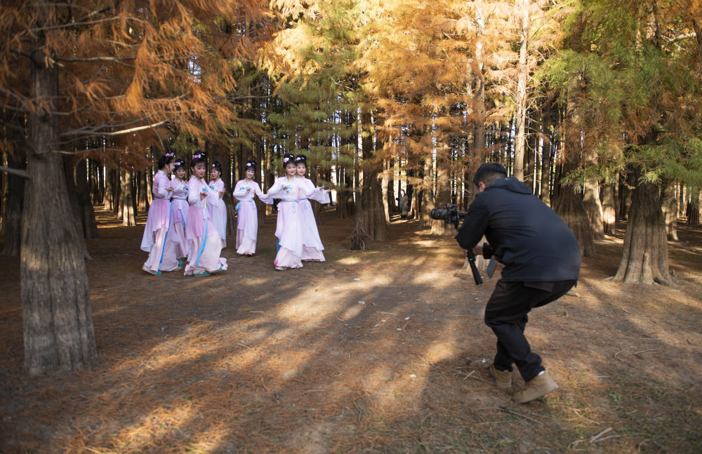 2024年11月28日,在安徽省安庆市怀宁县雷埠乡,谢慧慧(演员前排左一)和同事参与剧团短视频录制。谢慧慧是安徽省安庆市怀宁县黄梅戏剧团的一名演员。业余时间,她和团里的演员在剧团的社交网络账号上直播和发布短视频,希望观众们通过网络直播和短视频了解黄梅戏后,也愿意到线下观看演出,让黄梅戏更好地传承下去。
